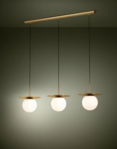 ARENALES Pendant Light – Brushed Brass Steel & Matte-Opal Glass – 3×E27 Sockets – Length 110cm × Width 27.5cm × Height 150cm – IP20 – Linear Globe Cluster Design