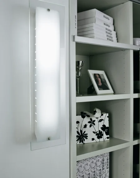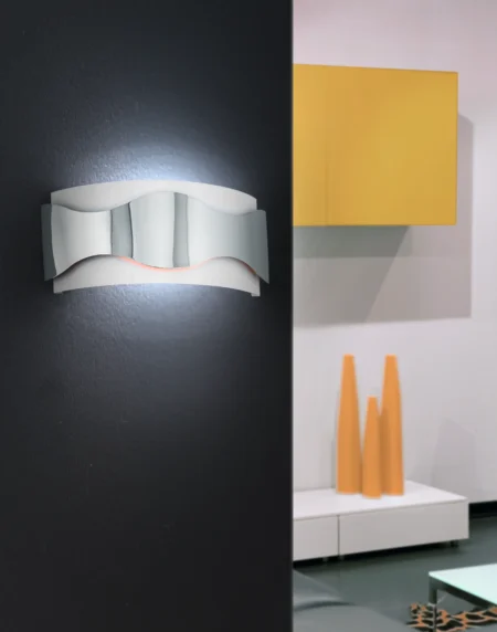 FREERIDE wall light in chrome and white finish with orange inside steel shade. Features 1 G23 ESL lamp emitting warm white light, suitable for modern indoor settings.