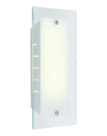 Compact ceiling lamp with white steel frame and white‑clear glass, delivering warm‑white 2700 K light from an included 11 W ESL rod (G23), IP20 indoor.
