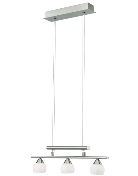 Height-adjustable BETTA pendant light with satin nickel steel frame and white matte opal glass shade, featuring warm G4 halogen lamps.