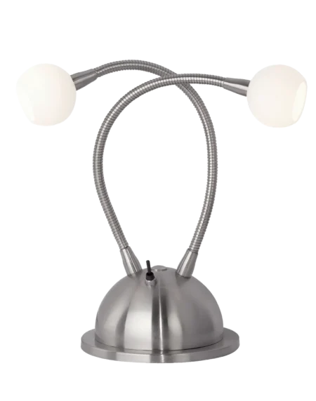 Petite table lamp with two included G4 halogen capsules, 20 W total, approx. 300 lm each at 2700 K warm white; IP20, Class II.
