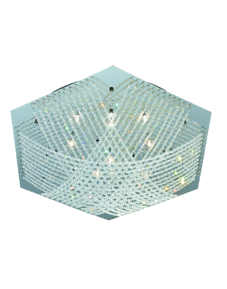 Large square ceiling lamp in chrome with clear brilliant glass, featuring 16x included G4 halogen capsules (300 lm each, 2700 K), IP20 indoor, Class II.
