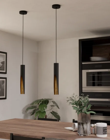 BARBOTTO Pendant Light 900872 – Black & Gold Steel GU10 LED Hanging Cylinder, 110cm Drop