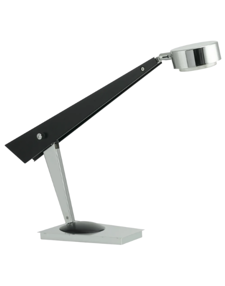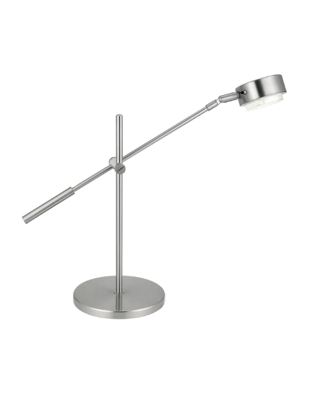 Satin‑nickel office table lamp with articulated arm and rocker switch, includes 1×GX53 7 W ESL at 2700 K warm white, 440 mm height with 515 mm reach, IP20 Class II.
