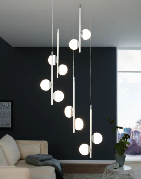 OLINDRA 10‑Light LED Cascade Pendant, White & Chrome Steel, Integrated LED (2,500lm, 3000K), Dimmable, Adjustable 1.5m Height, Ø370mm, 5‑Year Warranty