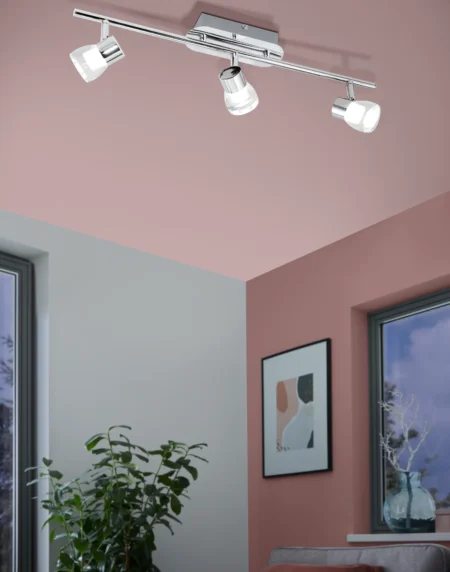 Modern Perito spot light with chrome steel and aluminium enclosure. Features clear satin-finish plastic shade, three 3W non-replaceable LEDs, and warm white lighting in indoor settings.