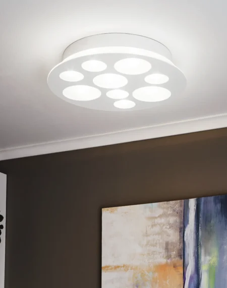 White ceiling lamp with satin glass diffuser and 9x integrated LEDs delivering neutral white light.