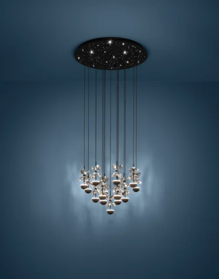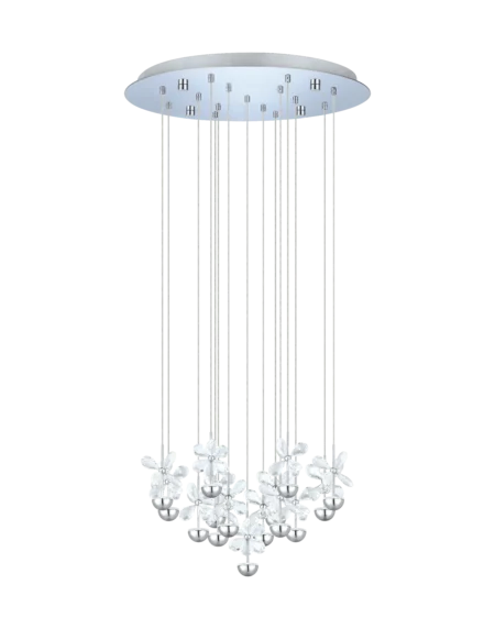 PIANOPOLI 15‑Lamp LED Crystal Pendant – 19.7″ Ø, 43″ Drop, Chrome Stainless Steel & Brilliant Crystal, Warm 3000K, Replaceable LEDs, 5‑Year Warranty