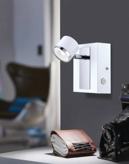 Compact Pierino 1 spot light with steel enclosure in white and chrome. Designed for indoor use, it features replaceable LED with 5W power and warm white illumination.