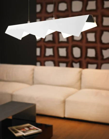 The RUFO 1 pendant light features a classic white steel enclosure paired with a white satin glass shade, offering a timeless and soft illumination for indoor settings. Measuring 1100 mm in height with a width of 125 mm and length of 770 mm, the pendant light is height-adjustable manually between