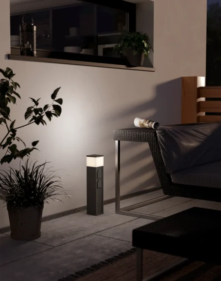 Modern Cast Aluminium Design Sleek anthracite finish with a clean rectangular profile—adds a contemporary touch to outdoor spaces like patios, walkways, or garage walls (tools. EGLO. com) Integrated Warm LED Module Features an 8W LED delivering ~600lm at 3000K—creates a welcoming glow without needing a separate bulb Compact