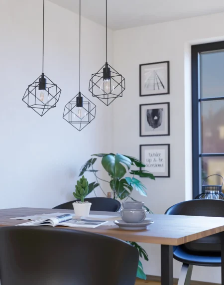 STRAITON 3‑Lamp Pendant – Black Steel Interlocked Wire Cube Shades – Ø65cm × 110cm H Adjustable – E27 Sockets, 3×60W – Industrial Vintage Ceiling Lamp