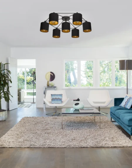 Staiti 97895A 7‑Lamp Black & Gold Semi‑Flush Ceiling Lamp, E27 Fabric Cylinder Shades, 84cm Ø x 24cm H, 220–240V, IP20
