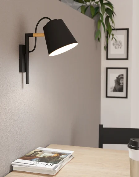 LACEY Wall Lamp – Black Steel and Brown Wood Body with Cream Inner Shade – E14 Socket – Dimmable – New Nordic Design – Ideal for Living Room, Bedroom, or Hallway – 2-Year Warranty