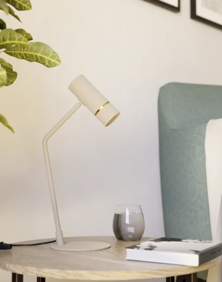 The CAMINIA table lamp features an elegant blend of sandy steel and brushed brass, delivering a warm, modern aesthetic. With integrated warm white LED lighting and a convenient in-line switch, it is ideal for bedside tables, desks, and ambient lighting in contemporary interiors.