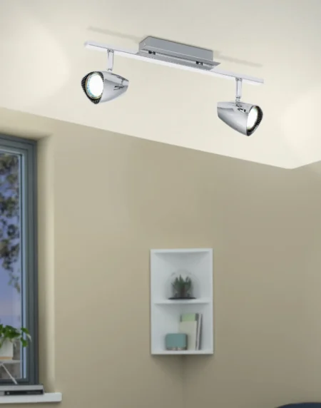 Chrome 2‑light indoor spot with included LEDs: 2×3W GU10, 3000K warm white, 240 lm each; IP20, Class I; L365 × W105 mm; energy‑saving.