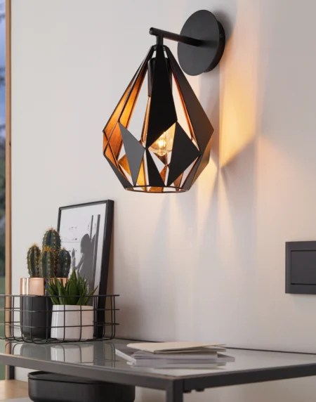 CARLTON 1 Wall Light – Black & Copper Steel Frame – E27 Socket – Max 60W – Vintage Geometric Design – IP20 – 33 cm Height – 2-Year Warranty