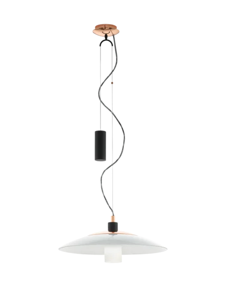Adjustable copper and black steel pendant light with white glass shade, 60W E27 bulb.