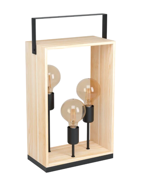 FAMBOROUGH 3‑Light Table Lamp – Black Steel & Natural Wood Base – 30.5×16cm, 56.5cm Height – Inline Switch – E27 Sockets, 3×40W Max