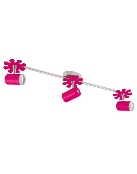 Children’s indoor 3‑light spot in satin nickel and pink; includes 3×3W GU10 LEDs, 3000K warm white, 240 lm each; IP20, Class I; L755 × W110 mm.