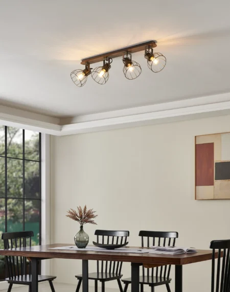 SAMBATELLO98137 4‑Light Ceiling Spot Bar – 79.5cm Wood & Silver Steel with Adjustable E27 Cage Shades, Vintage Industrial, IP20, 2‑Year Warranty