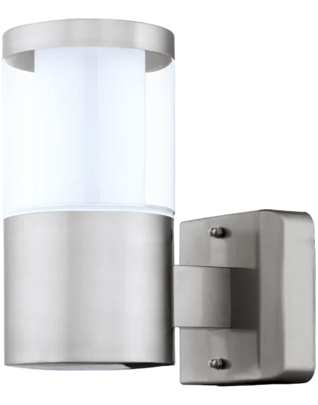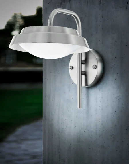 Modern Exterior Design Sleek stainless steel body with a curved shade and white plastic diffuser—perfect for patios, balconies, and entrance areas. Integrated LEDs Included Features three 2. 5W warm white LEDs (totaling 540lm at 3000K); energy efficient Lamping with ~25,000hr lifespan