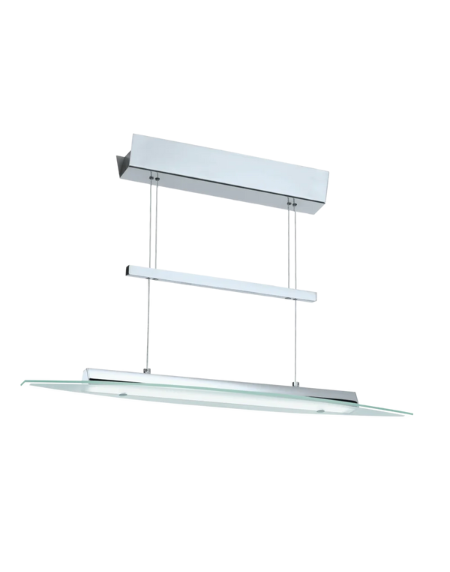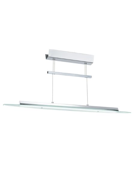 Modern "RUFO 12" pendant light with chrome aluminium and steel enclosure and satin glass shade, housing four warm white LED lamps.