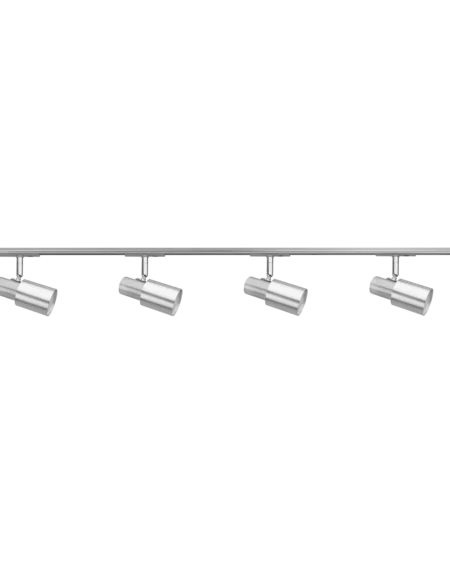 Indoor lighting system with brushed aluminium and satin nickel finish, featuring four GU10 ESL lamp sockets for customizable warm white lighting.