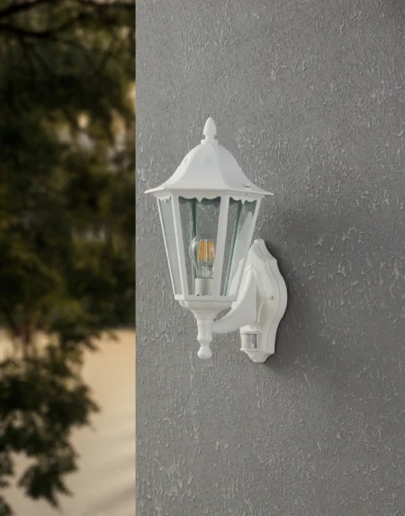 NAVEDO Outdoor Wall Lantern – White Cast‑Aluminium with Clear Glass, E27, Motion Sensor, IP44 Waterproof