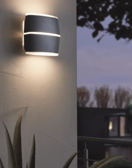 Minimalist Modern Design Slim, anthracite die cast aluminum body with two subtly faceted white plastic Lamp reflectors—perfect for contemporary porches, gates, or garden walls and blends with many exteriors. Bright Integrated Dual LEDs Two 2. 5W warm white (3000K) LED modules deliver a total of 360lumens; energy efficient with ~25,000hours