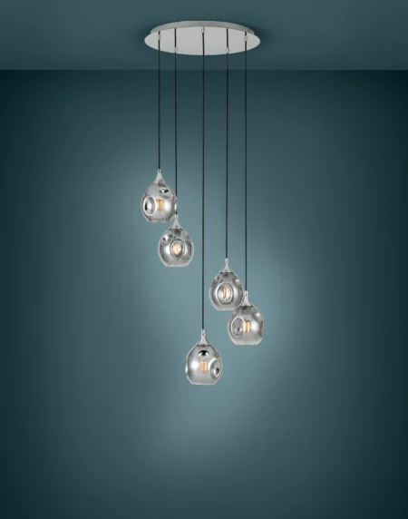 Bregalla39682 5‑Light Pendant – Chrome Steel Frame & Black‑Transparent Vaporized Glass, 5×E27 Sockets (Max40W Each), Ø550mm × H1500mm (Adjustable), IP20 Indoor – 2‑Year Warranty