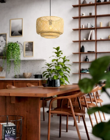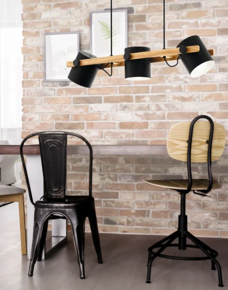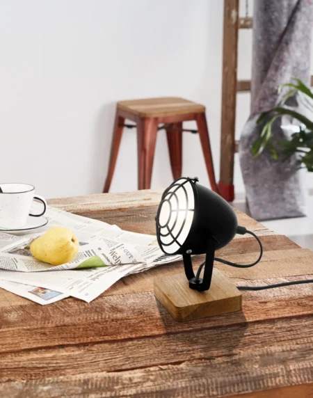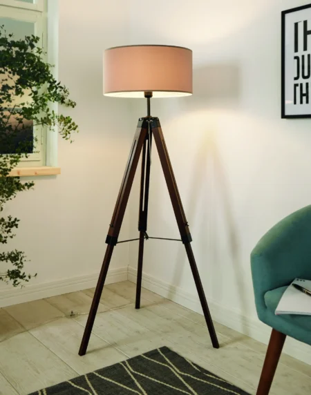 Stylish LANTADA floor light featuring a blend of wood and steel with nut accents. Adjustable height and E27 bulb compatibility make it perfect for modern interiors.