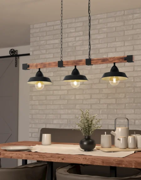OLDBURY Pendant Light – 3‑Light Rustic Wood & Black Steel (Model 49685)
