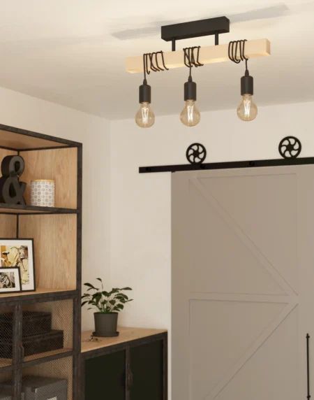 TOWNSHEND Pendant Light – Black Steel & Wood – 3×E27 Sockets – Length700mm × Width100mm × Height1,100mm – IP20 – Vintage Linear Cluster Design