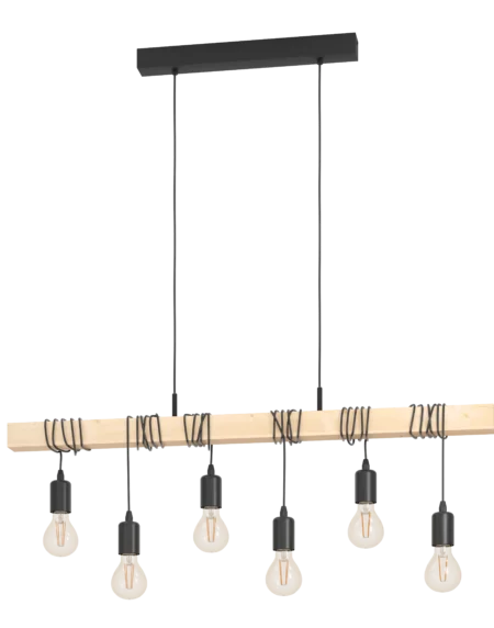 TOWNSHEND 95499 Rustic 6‑Light Pendant – Black Steel & Solid Wood Bar, E27 Sockets, 39″ × 4″, 43″ Drop, Vintage Industrial Look