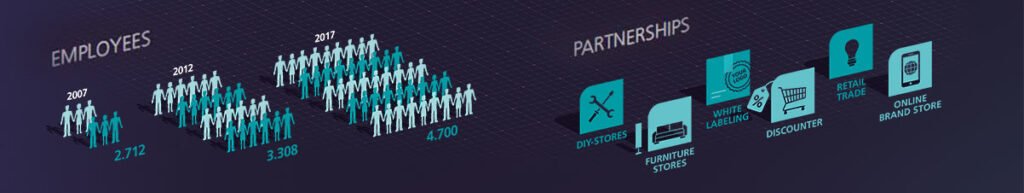 Our headcount has nearly doubled in 10 years (from 2007 to 2017). The number of companies of the EGLO Sales Group grew five-fold in 20 years (1997 to 2017).