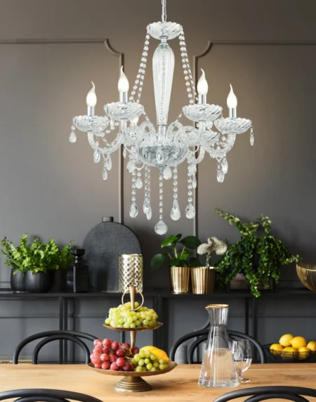 CARVARIO 39723 Pendant Light – 7×E14 Candle Sockets (Max40W Each), Chrome Steel with Clear Crystal‑Style Glass, Ø470mm × H1100mm – IP20 Indoor – 2‑Year Warranty