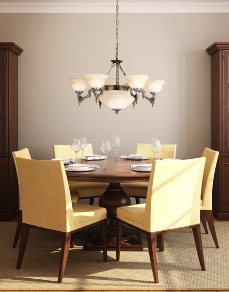 MARBELLA 6 Light Pendant Chandelier – 110 cm Height – E14 Sockets – 60W Max per Bulb – Champagne Alabaster Glass Shades – Antique Bronze Finish – Indoor Use