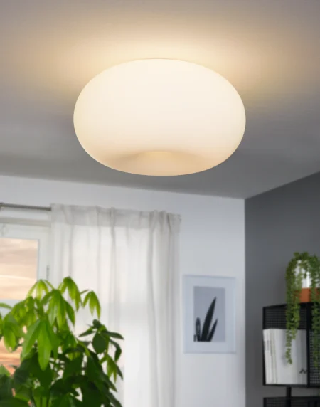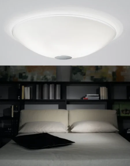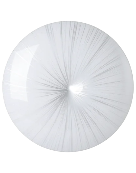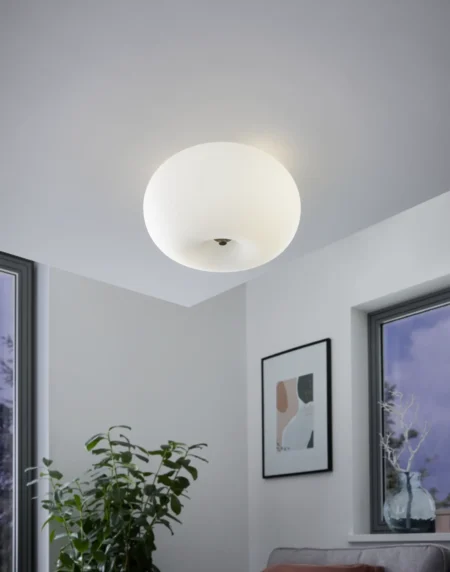 Large round ceiling lamp with white‑chrome steel trim and white‑clear painted glass, featuring an E27 lamp holder up to 60 W (lamp not included), IP20 indoor.