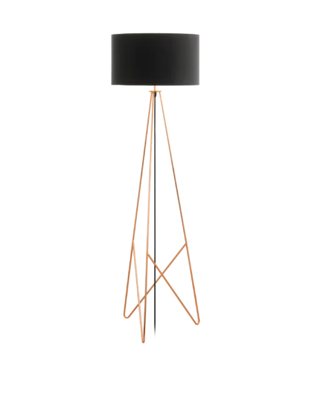 A modern design floor lamp with a copper steel base and black fabric shade, offering stylish illumination for any room. Featuring an E27 socket (up to 60W, bulb not included) and a foot switch for easy operation, it is crafted for durability and comes with a 2 year warranty.