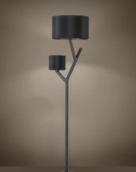 An elegant sculptural floor lamp with twin black fabric shades and an asymmetrical black steel base, creating a modern visual anchor. It features dual E27 lamp holders (up to 40W each, bulb not included), offering flexible Lamping. Standing 1,630 mm tall, this lamp is perfect for reading corners or as
