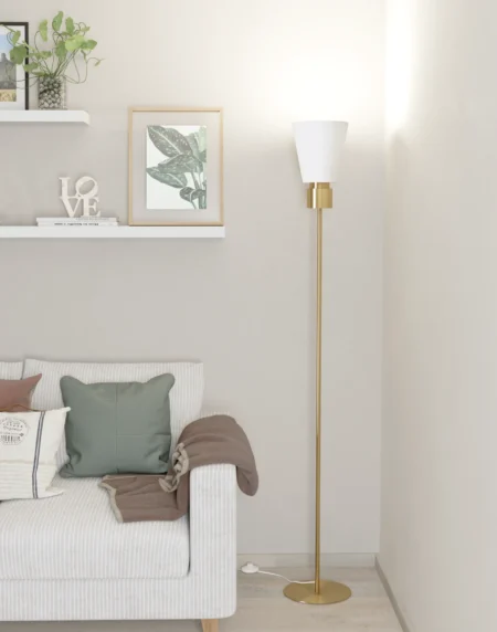 Elegant upright design Tall 1,700mm (66. 9″) steel floor lamp finished in sophisticated brushed brass, topped with a white/brass fabric shade for modern interiors. Perfect dimensions Overall height 1