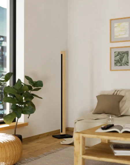Sleek black & wood aesthetic – Matte black steel stem with a natural rubberwood contrasting accent complements modern or minimalist interiors. Integrated dimmable LED – Features a 22W LED delivering 2,400lumens at warm 3,000K; touch sensitive dimmer on base for effortless brightness adjustment. Ideal floor lamp dimensions Height 1,260mm (49