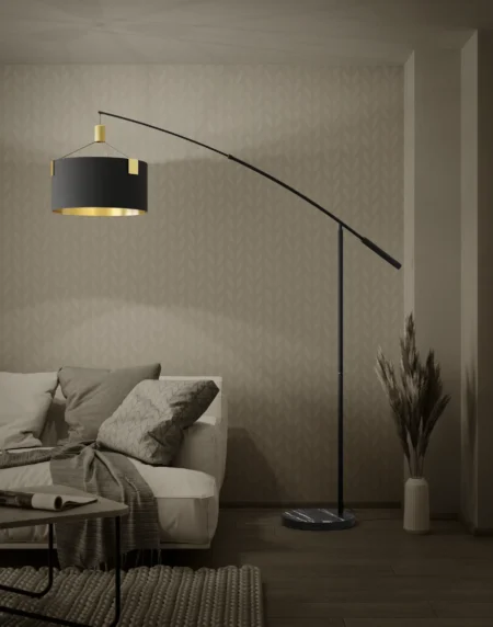 A dramatic arc-style floor lamp designed to make a bold statement in large living spaces.