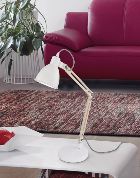 The TORONA 1 table lamp features a sleek white steel design, combining modern aesthetics with functional illumination. Compatible with standard E14 bulbs, it is ideal for bedside tables, study desks, or living room accent lighting.