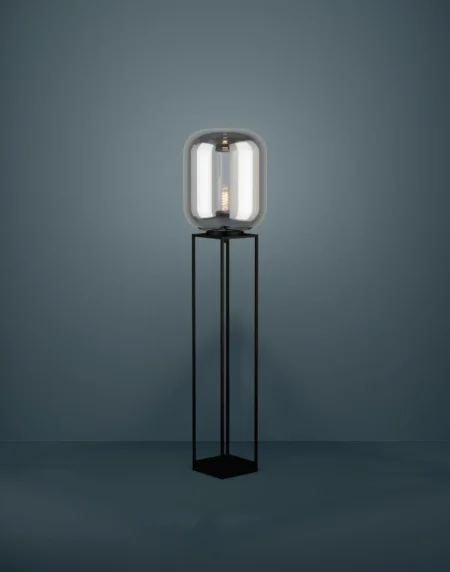 A modern floor lamp with a bold black steel finish, perfect for ambient lighting in living rooms and bedrooms.
