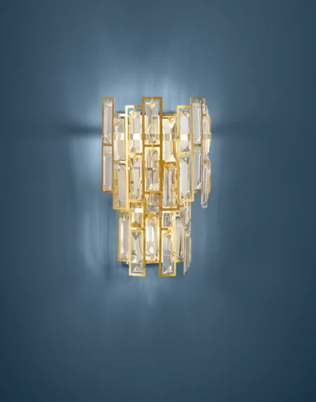 CALMEILLES 39615 3‑Lamp Crystal Wall Lamp – Brass Finish Steel with Clear Glass Crystals, 3×E14 Candle Sockets (Max40W Each), 330×140×217mm, IP20 Indoor – 2‑Year Warranty