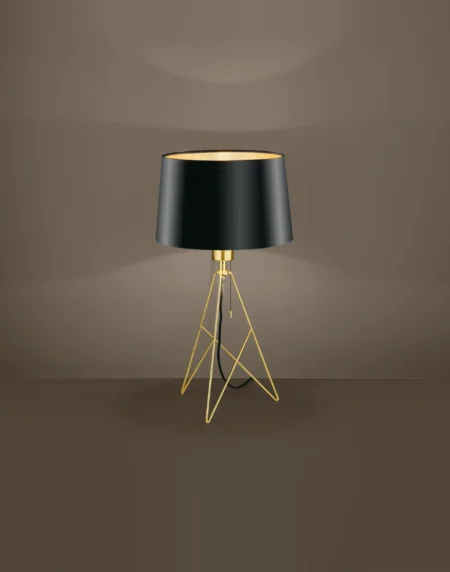 A chic table lamp featuring a brass finished steel base and black fabric shade with a gold interior. It is equipped with an E27 socket (up to 60W, bulb not included) and provides ideal Lamping for desks or side tables. Designed with a convenient rocker switch, it is backed by