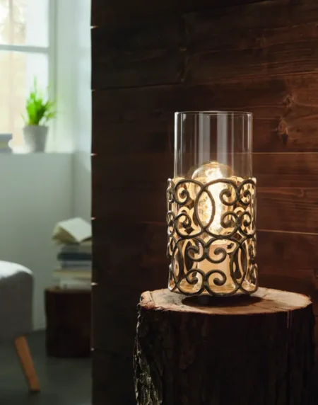 Charming Vintage Design Features a clear glass cylinder nestled in an intricate brown‑patina steel cage—evoking nostalgic, bohemian, or Art Nouveau inspirations. Single E27 Socket Requires one E27 bulb (max. 60W; not included), compatible with decorative filament, LED, or classic incandescent options