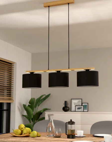 CASTRALVO 3‑Lamp Pendant – 97.5cm × 17.5cm × 110cm, Brown Wood & Black Fabric Shade, 3 × E27 Sockets, Adjustable Textile Cable, 2‑Year Warranty